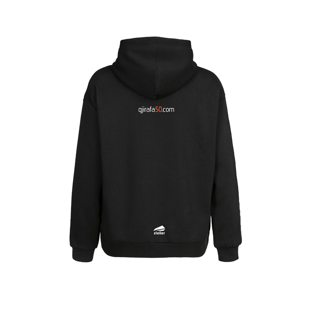 The material of the hoodie is 100% polyester and the main color is black combined with white and red details, and is proudly created alongside Gjirafa50.
